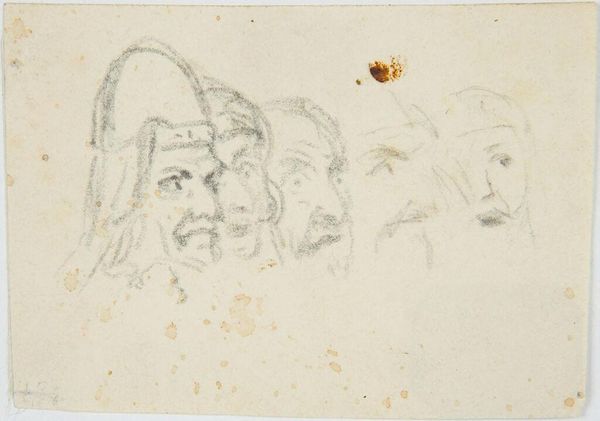 Curator: Let’s explore this intriguing drawing, "Four Male Heads, for 'Belshazzar's Feast'" by Washington Allston. It’s currently part of the Harvard Art Museums collection. Editor: It's small, intimate. The figures seem to emerge tentatively from the paper's surface, an almost ghostly assembly. Curator: Indeed. Allston meticulously renders the textures of beard and headwear through subtly hatched lines. The composition, with its overlapping heads, is an exercise in Renaissance-inspired pictorial structure. Editor: But what of the paper itself? Its absorbency influenced the graphite's mark-making. This speaks to a whole world of production, of the materials’ inherent qualities guiding the artist's hand. Curator: Though the material plays a crucial role, I read the expressions here as hinting towards a dramatic narrative, a psychological depth. The layering creates a visual and emotional complexity. Editor: Perhaps, but the sketch exists because of its grounding in the everyday realities of material and labor. Curator: It’s clear we both see something unique in Allston’s work. Editor: Precisely, and these different perspectives enrich our appreciation.
