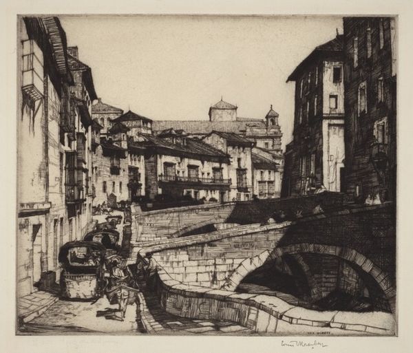 Editor: Here we have Zinaida Serebriakova’s "Collioure. Bridge with Goats," created in 1930 using watercolor. There's something charmingly simple about it. The earthy tones create this very warm, sun-drenched feel. What’s your interpretation? Curator: I'm particularly drawn to the watercolor medium itself. Consider the societal implications; watercolor was often relegated to the domestic sphere, deemed 'less serious' than oil. Serebriakova, by embracing watercolor in this cityscape, seems to be engaging with a broader discourse about artistic labor and value. What do you make of the contrast between the seemingly traditional subject matter, the bridge and goats, and the 'humble' material of watercolor? Editor: That’s a very interesting point about watercolor being seen as a less serious medium. The bridge and goats do give a sort of pastoral feeling, making you almost forget the technique involved in producing the picture. I mean, is Serebriakova almost making a comment on the way our understanding of "serious art" dictates our experience of looking at it? Curator: Precisely! Look at the quick, fluid brushstrokes, indicative of rapid production. Could this suggest an attempt to capture the fleeting essence of daily life, mirroring the transient nature of labor and movement within the town? Think about who owned such works – how accessible and at what price, influencing its significance and message? Editor: So it’s not just about the scene itself, but the whole story around how it was made, consumed, and valued. Curator: Absolutely! Examining the materials and process reveals a layer of social and economic commentary that we might otherwise overlook. Editor: I never would have looked at a pretty watercolor like this and considered its broader context! Curator: It changes everything, doesn't it?