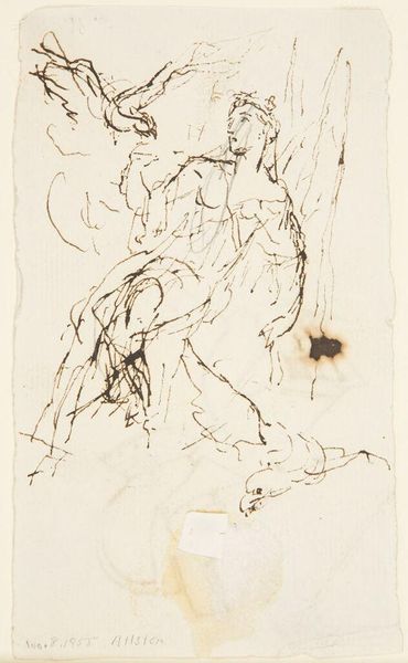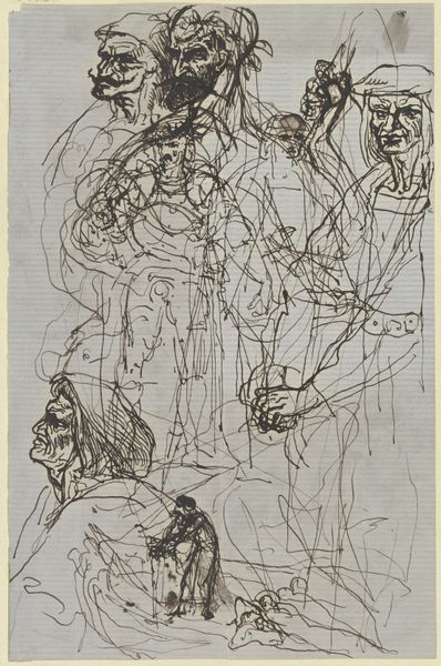 Curator: This is "Studieblad met een dansende beer, een fluitspeler en circustypes," a study sheet with a dancing bear, a flute player, and circus types by Simon Andreas Krausz, made sometime between 1770 and 1825 using pen and ink. Editor: The energy is incredible! The lines are so frenetic, so alive. It looks like the artist was trying to capture a fleeting moment, a burst of movement. Curator: Indeed! Think about the culture surrounding travelling performers at this time. These weren't spectacles staged in dedicated theaters; they were often street performances, temporary amusements catering to a wide, often working-class, audience. The sketch captures that sense of transience. Editor: I see what you mean. The composition almost fights against any stable reading. Figures overlap, lines are repeated. It echoes that feeling of being caught up in a crowd, glimpses of action happening all around. It's quite abstract, really. Curator: Precisely. The rapid, almost chaotic, lines are characteristic of a sketch. This wasn't about creating a polished product; it was about recording an observation, preserving an impression. And the social dynamic it hints at – the power dynamics between performer and audience, the commodification of animals… it all deserves scrutiny. Editor: I'm drawn to how the light and shadow are rendered. It is a sparse usage of chiaroscuro in the tonal gradations. The lines are so delicate, they almost dance across the page mirroring the central scene Curator: And think about where a piece like this might have circulated. It might have been a model for future work, or just part of an artist's reference collection, documenting different social types, capturing details of dress or movement. These studies were the foundation upon which more "finished" artworks were often built. It speaks to the realities of artistic labor. Editor: It’s a wonderful testament to capturing life as kinetic expression. So many artists are confined to merely representing things as they statically exist. Krausz delivers this dancing bear with the essence of its motion. Curator: This drawing provides a great example of how art serves as a historical document and lens for exploring a past culture's spectacle. Editor: Indeed, a dynamic image that reflects on art as fleeting, moving light.