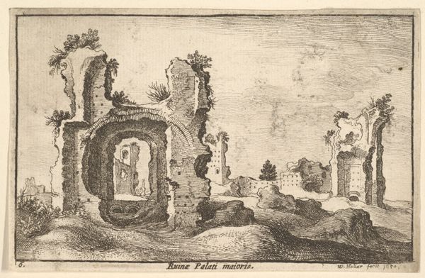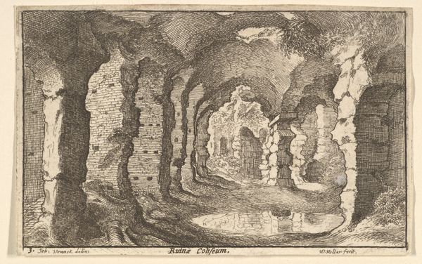 Wenceslaus Hollar etched this image of the Roman Amphitheater, capturing a scene laden with the poignant iconography of ruins. Notice how the crumbling architecture and overgrown vegetation evoke a sense of decay, a stark contrast to the original grandeur of the Roman Empire. The amphitheater itself, once a stage for public spectacles, stands as a silent witness to the passage of time, a symbol of vanished power. This motif of ruins reappears throughout art history, from Piranesi's dramatic engravings to Romantic paintings. Reflect on the concept of "memento mori"—the remembrance of mortality. This engraving acts as a reminder of the transience of human achievement. The architecture has given way to the power of nature and the human figures walking among these ruins invite contemplation on the cyclical nature of civilization. It's as if Hollar tapped into a collective memory of loss and change, echoing through the ages.