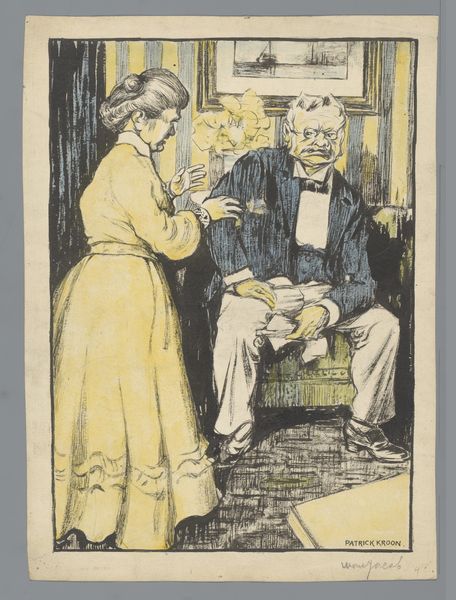 Editor: This is Norman Rockwell’s "My Mother," created in 1918. It’s a painting, seemingly a portrait. I’m struck by how ordinary it feels. It seems so everyday, yet there's a certain poignancy given the era. What stands out to you about this piece? Curator: Well, let's look at the knitting. Notice the very act of repetitive handwork. In 1918, what social class would likely have time and need to create textiles in this way? It points towards ideas around domestic labor and value. Consider the mass-produced photo that the soldier is holding. He seems so pleased by it! Why would he value a mass-produced and easily copied portrait of his mother over his *actual* mother sitting in front of him? What does the interplay between the knitted object, the photograph, and Rockwell's oil paint on canvas tell us about labour and authenticity? Editor: That's interesting; I hadn’t thought about the materials that way. So you are seeing social commentary on value in production and labor? Curator: Exactly. We often divorce the artist from social-political events and daily living by idealizing materials of high art! Is there not incredible labor in both activities -- mother at labor through knitting, while soldier holds manufactured portrait as some token, while Rockwell labored on this oil painting on canvas? I think it asks us to consider our valuation of labor -- from manufacturing all the way to Rockwell’s creation. Editor: That totally shifts my perspective. Seeing the labor in all of these objects--and understanding how that labor has very different social valuations–helps me appreciate the work on a new level. Curator: Right, exactly! And how Rockwell depicts it...the subtle narrative, with this material focus, changes the whole feel. Now, where does your eye go first?