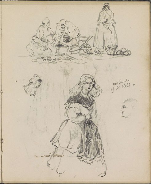 Isaac Israels made this sketch of 'Drie staande vrouwen' with graphite on paper, and what strikes me is the economy of his line, each stroke doing so much work. It’s like he's thinking on the page, letting the graphite lead the way. Look at how he’s captured the weight of their forms with just a few strokes. The texture of the paper peeks through, adding a kind of breathiness to the scene, and the smudges around the lines suggest a real sense of movement and time passing. It’s not about perfection; it’s about capturing a moment, an impression. The way he suggests the folds in their clothes with just a quick scribble – that’s where the magic happens. This reminds me a little of some of Degas' sketches, that same interest in capturing fleeting moments. But Israels brings his own sensibility. For me art’s about that conversation across time, each artist adding their own little whisper to the mix.