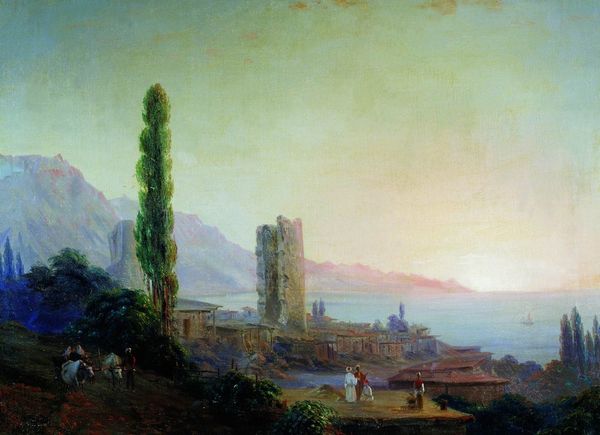 Editor: Here we have Ivan Aivazovsky's "Chapel on seashore," painted in 1847 with oil paints. It evokes such a serene, almost ethereal feeling. The composition is remarkable with the soft light dominating the sky. What do you see when you look at this piece? Curator: The luminosity is indeed striking. Note how the light isn't just illumination, but also volume and form. Observe the hazy atmosphere achieved through delicate gradations of tone; it unifies the composition by creating a tangible sense of depth. How do you see the balance between the figurative elements, like the chapel and figures, and the vastness of the seascape? Editor: I hadn’t thought of it that way. I guess the smallness of the chapel and figures emphasizes the grandeur of nature. Is there significance to their placement in the foreground? Curator: The positioning directs the viewer's gaze into the landscape, a compositional technique effectively used to lead the eye, as is the interplay of light and shadow which defines form. Think of the chapel and figures as repoussoir elements. What do you make of the restricted colour palette? Editor: It contributes to that serene feeling I mentioned, almost dreamlike. It makes me feel calm. The fog blurs the details in the distance. It unifies the scene as a whole and suggests a hidden mystery or beauty that awaits us. Curator: Precisely. Aivazovsky has clearly orchestrated the light and the limited colour range to construct a landscape brimming with contemplative beauty. It offers us a view of something vast, unknowable, but utterly seductive, don't you think? Editor: Yes, absolutely. Analyzing its structure helps appreciate how the artwork generates these powerful effects. It’s so much more than just a pretty picture. Curator: Indeed. It highlights the intrinsic relationships between the structural elements, providing insights into the generation of aesthetic experiences.