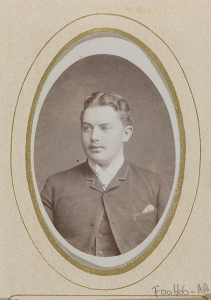 Curator: This striking photographic portrait, dating from around 1860 to 1905, is attributed to Jan Goedeljee. Titled "Portret van een jonge man in uniform," it immediately evokes a particular era. What are your first impressions? Editor: There's a formality to it, of course, a stillness typical of early photography. But what resonates most is the melancholy. His eyes, despite their sharpness, convey a quiet sadness, like he is weighed down by a sense of duty. Curator: The uniform plays a critical role, instantly communicating societal structures of power, national identity and the burden of expectations placed upon young men of that period. These portraits offered both personal keepsakes, and promoted social cohesion in an age of dramatic political change. Editor: Absolutely, and consider the deliberate arrangement: the crisp tailoring of the jacket, each button perfectly placed, contrasted against the softer edges of his face and hair. The oval frame too reinforces a sense of romantic, even idealized masculinity—a visual shorthand for an honorable life of service. The stars on the collar are a bit mysterious. Curator: We can view those as signifiers of aspiration and upward mobility within a clearly hierarchical system. This portrait speaks to the rigid social expectations inherent within militaristic societies, the visual presentation creating not merely an individual, but the embodiment of civic duty. How are those symbolized values echoed through the generations? Editor: You see traces of that same symbolic language echoed even now in modern portraiture when trying to represent trustworthiness, just tweaked with modern sensitivities. Consider those sharp lines around the jaw – we know they had to hold still for an extremely long time to create this photo! I'm guessing for his loved ones this picture held complex memories; bravery maybe mingled with an understanding of human frailty in the face of inevitable mortality. It's poignant, really. Curator: Poignant, indeed. It serves as both historical record and an emotional testament; that even within the structures of social representation, personal narratives find expression. Editor: Exactly, offering us a layered reading between visual symbol, history and an enduring story of an individual, his place in his community, his feelings.