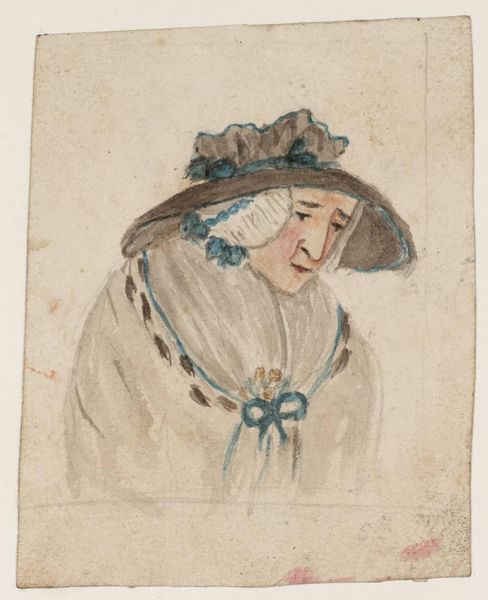Curator: There's an immediate sweetness about this sketch; the subject's rosy cheeks and the almost innocent quality of the hat give it a nostalgic charm. Editor: William Henry Hunt rendered "A Girl, Full Face, Wearing a Hat" using graphite and watercolour on paper. It strikes me as a piece deeply invested in the social performance of femininity. Look at the textures; the labour involved in each stroke. Curator: I see the hat as a symbol of youth and potential, a protective halo almost. Her gaze isn't direct, suggesting contemplation, or perhaps even a hint of longing. Editor: But consider the materials themselves. Graphite readily available, watercolour a common medium; this aligns with Hunt’s broader interest in accessibility and the democratisation of art production. Curator: Perhaps, but the hat itself speaks to a certain social standing, a visual cue of belonging to a particular class. It's both protective and performative. Editor: Indeed. The tension between the accessibility of materials and the markers of class through fashion is compelling. It underlines the complex relationship between art, labour, and social identity. Curator: Agreed. The sketch leaves one pondering both the subject’s inner world and the social world she inhabits. Editor: A poignant reminder that even seemingly simple images are imbued with layers of meaning, shaped by both materials and context.