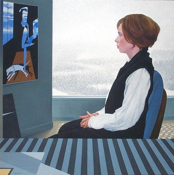 Curator: Nigel Van Wieck, the artist who rendered "Plaza Hotel" with acrylic on canvas, invites us to observe a narrative suspended in time. What strikes you first about this scene? Editor: The woman’s gaze—it’s intensely directed, yet seems unfocused. It speaks of a deep contemplation, perhaps disillusionment, or a silent protest against her environment. It also feels so claustrophobic with the limited framing on the right and the bars of the door frame to the left. Curator: Interesting. The partial view gives us an opportunity to speculate. Van Wieck might be highlighting how women are perpetually observed and subtly restricted, even in supposedly free spaces. Do you agree that it is genre painting? The theme that captures modern life, rather than grand history? Editor: Absolutely. I believe the setting within the hotel space serves as an important detail for discussions related to class, leisure, and gender roles within societal structures. There is a lot going on, though everything looks placid from the exterior. What a life! Curator: It’s like the canvas is offering us an intimate glimpse, a snippet of an untold story, without handing it to us on a plate. It’s intriguing, but also unsettling, like overhearing a fragment of a very intense conversation. Do you find the use of color reinforcing that sense of quiet unease? Editor: Definitely. The color palette is interesting, blending harsh yellows, against cooler blues and lavenders, indicating a society fractured between public veneer and private anxiety. But overall the coloring and textures of the canvas give an interesting vintage feel. This feels nostalgic to a forgotten story. Curator: Nostalgia, yet with an edge—I appreciate your take. For me, there’s also an echo of Hopper's sense of detached observation here, capturing a certain mood of modern isolation even within places designed for socializing. Editor: Indeed. Van Wieck has crafted a space rife with complexity—it invites the audience to piece together the silent narratives, fostering a deeper reflection on social dynamics and individual experiences, which I find to be so fascinating. Curator: It gives a moment frozen in time, inviting you to explore.