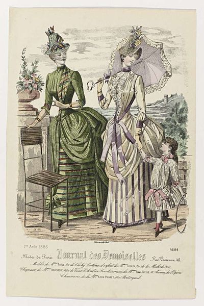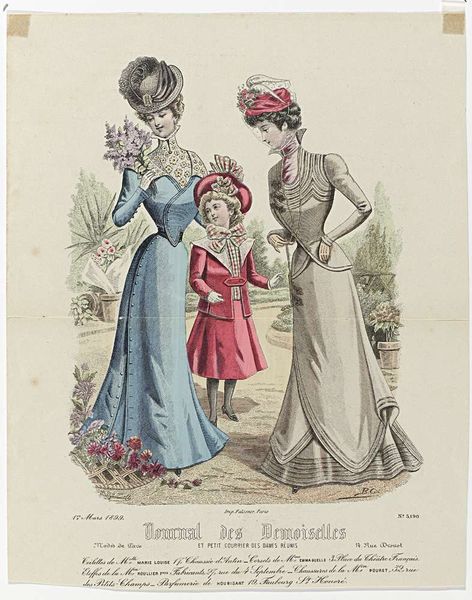 P. Deferneville created this fashion plate for the February 1886 issue of *La Femme et la Famille*, a French magazine. Through carefully chosen attire, it presented an idealized image of bourgeois womanhood and domesticity. Published during the Belle Époque, the print reflects the era's emphasis on etiquette and consumer culture. These clothes were for women who did not work and is an image of the ideal woman as primarily a wife and mother. Each costume is designed to highlight the body while still conforming to the conventions of modesty and class. The woman on the left with the most elaborate costume signals that femininity was not just natural, but a performance. The clothing of the children reflects the different stages of childhood and the careful cultivation of gender roles from a young age. Consider that access to this magazine and the ability to replicate these fashions reinforced existing social hierarchies. But do take a moment to imagine the rustle of the fabrics, the chill of the winter air, and the delicate scent of the perfumes advertised on the page. While the image is about aspiration, there is still room to consider its emotional appeal.
