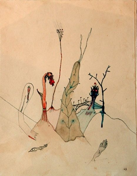 Editor: This is John Dowell's "Triangular Fugue II" from 1965, made with ink, and what I believe to be a print technique, it feels like organized chaos – energetic and frenetic. What historical contexts shaped its creation? Curator: Well, consider 1965. The Civil Rights Movement is gaining momentum, the Vietnam War is escalating, and artists are grappling with social upheaval. This piece reflects that. Editor: In what ways? The style looks a little like abstract expressionism but looser, or is there something else there? Curator: Exactly! Abstract Expressionism was waning, but its emphasis on personal expression and mark-making was influential. Dowell seems to push against pure abstraction, injecting figurative elements. Think about what "figuration" meant for Black artists in that moment. Whose stories get told and how? Also, what public role did images of Black life serve? Editor: So the ghostly figures, the suggestion of landscapes…are they actively responding to political debates, or perhaps engaging with African American oral traditions, signifying freedom or a way to navigate the complicated racial dynamics of America at the time? Curator: Precisely. The ambiguity is key. Dowell isn't giving us a straightforward narrative, and he uses geometric shapes as visual metaphors. Instead, he invites us to contemplate the complexities of identity and experience, as it shifts into a fugue of sorts. He is trying to bring some calm into what he must have experienced. Editor: That makes sense. So it's not just about personal expression, but about engaging with larger societal issues through visual language. It seems Dowell wanted viewers to reflect on it and not give an explicit understanding. Curator: Exactly. The "Fugue" gives a lot to think about, in relationship to the music term and its social commentary. Editor: This makes me appreciate the artwork so much more. Thank you. Curator: Likewise. This discussion gives me fresh perspectives too!