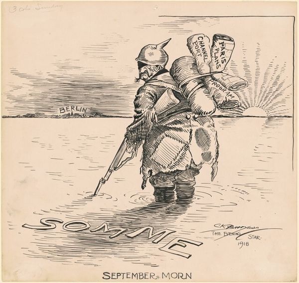 Editor: Clifford Kennedy Berryman's 1941 drawing, "Again, The Helping Hand," strikes me as incredibly bleak. The figures seem stranded, almost drowning, in this turbulent sea of pen strokes. What do you see here, beyond the obvious political commentary? Curator: Well, isn’t it interesting how a simple line drawing can evoke such turmoil? To me, it’s the posture – Hitler, at the oars, looks decidedly UN-heroic, doesn't he? More like a weary ferryman on the River Styx. And little Mussolini! Doesn't he resemble a disgruntled, oversized toddler dressed for a very strange boat trip? The absurdity cuts deep. Editor: Absolutely, that contrast between the figures' cartoonish appearance and the grim situation is striking. Is that deliberate satire, would you say? Curator: I think satire is too gentle a word. Berryman captures the grotesque folly of their alliance, presenting it less as partnership and more as a codependent nightmare, doesn't he? The waves aren't just water; they’re symbolic of the rising tide of consequence, of chaos. Are they sailing towards salvation or oblivion, I wonder? Editor: Oblivion, definitely seems the more likely option. Seeing them rendered this way really highlights the fragility of their power. The little details, like the swastika on Hitler's hat, it's chilling, like a warning. Curator: Yes! A warning sketched in deceptively simple strokes. Art as a potent form of protest. Political cartoonists… they really were the original meme creators! Weren’t they? It just makes you wonder, doesn't it? Where is that boat headed now? Editor: It’s amazing how a single image can hold so much historical weight. Thanks for shedding light on the darker depths of this drawing! Curator: My pleasure. A picture may be worth a thousand words, but sometimes it's the silence between the lines that speaks the loudest, don't you think?