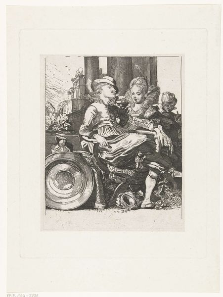 Edouard Taurel made this print of Kapitein Cornelis Jansz Witsen en luitenant Johan Oetgens van Waveren, but we don't know exactly when. Prints like these are images of power, wealth, and civic virtue in the Netherlands. It seems to commemorate an alliance or victory with the two men shaking hands in what might be a symbolic gesture. These men seem to be high ranking officers with the items they possess. During this time, the Dutch Republic emerged as a major maritime and economic power. The country fostered a culture of relative tolerance and intellectual freedom compared to its European neighbors. Dutch art became known for its realism, attention to detail, and focus on everyday life. The Rijksmuseum holds a significant collection of Dutch Golden Age art. Examining historical documents, such as city records, military archives, and personal letters, might shed light on the specifics of this alliance. Art history allows us to interpret the symbolic meanings embedded in its visual codes, revealing its complex social and institutional context.