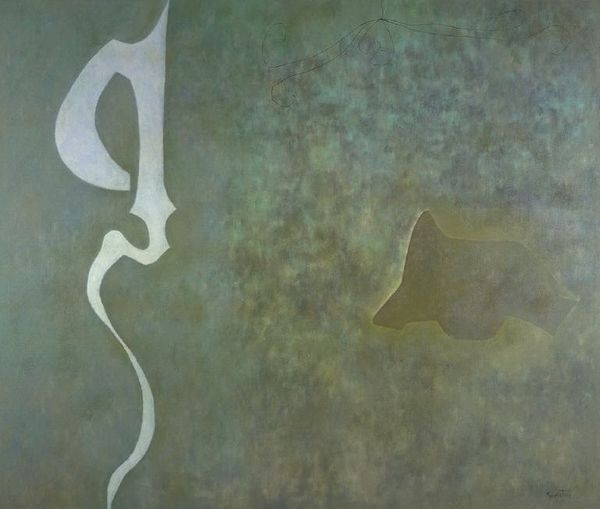 Editor: Here we have William Baziotes' "Aquatic," created in 1961. It’s a watercolor piece, and I find its ethereal quality quite captivating. The forms seem to float, almost like memories. How do you read its composition and color palette? Curator: The emphasis is undeniably on the interplay of forms and the subtly nuanced color fields. Note how Baziotes uses line not descriptively, but structurally, almost as a scaffolding for the more amorphous shapes. Do you perceive a spatial relationship between these forms, or do they exist primarily on the plane of the canvas? Editor: I see them mostly on the plane, yet the white form seems slightly forward, maybe because of its strong contrast with the background. Curator: Precisely. This tension between flatness and the illusion of depth is crucial. The hazy ground acts almost as a deconstructed grid. Semiotically, how might we understand these recurring motifs and forms? Editor: Are you suggesting the forms point to something beyond what they obviously represent? Curator: Not necessarily pointing, but perhaps evoking. They function as signifiers of an inner, almost subconscious landscape. We should think how each aspect—line, color, shape—contributes to the overall effect, quite divorced from narrative content. Editor: So, rather than seeking external meaning, we should examine the internal structure of the painting itself to decipher meaning? Curator: Precisely. Baziotes asks us to consider the act of painting as an event, a carefully orchestrated dance between intention and accident. Editor: That makes so much sense! Now, the placement of that calligraphic line seems so deliberate in its randomness. It gives the eye a place to rest. Curator: Indeed. This viewing exercise has highlighted the self-referential and profoundly elemental character of abstract expressionism.