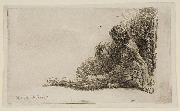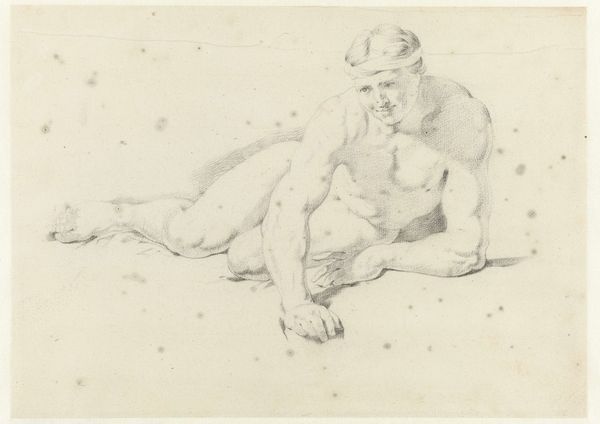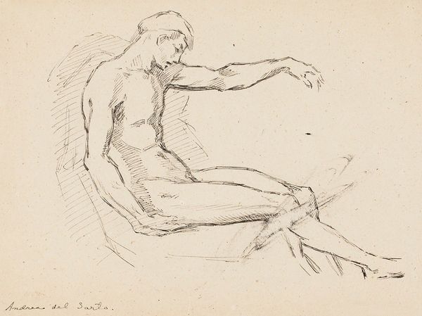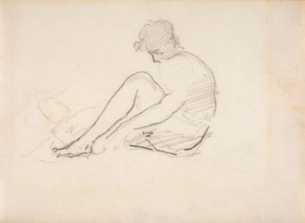Editor: Here we have Denman Waldo Ross’s pencil drawing, *Crouching Male Nude*. It's quite a simple sketch, but the figure’s downward gaze evokes a sense of introspection. What do you see in it? Curator: Notice how the downward gaze, coupled with the crouched posture, forms an archetype of contemplation, almost a visual representation of vulnerability and self-absorption. What cultural narratives might this evoke for you? Editor: I suppose it reminds me of the Greek ideal of the solitary philosopher, deeply absorbed in thought. Curator: Precisely. And this pose recurs across various cultures, signifying a pivotal moment of internal reckoning. The artist uses this common symbol to create a sense of shared human experience. Editor: I didn’t realize such a simple sketch could carry so much cultural weight!