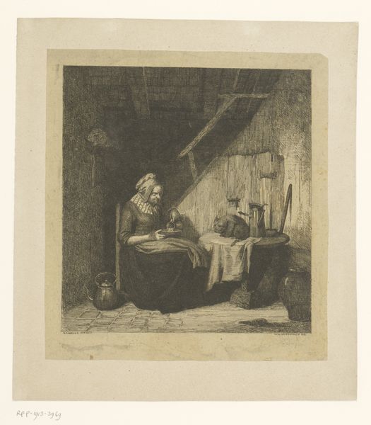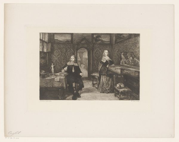 Hugo Bürkner created this print, "Interior with a Girl Reading to a Man," sometime in the 19th century, capturing a quiet domestic scene. During this period, the roles of women were often confined to the domestic sphere, literacy, and acts of service, as we see with the young woman reading aloud. The man, presumably older and in a position of authority, is the recipient of her service. The image speaks volumes about gender and generational dynamics. Is this an image of care, where knowledge is gently passed down through the act of reading? Or is it a portrait of dependency, a subtle reinforcement of societal roles where women are relegated to supportive roles? Bürkner's composition invites us to reflect on the labor, seen and unseen, that women perform. It subtly questions the traditional narratives of power and dependence that shaped 19th-century society.