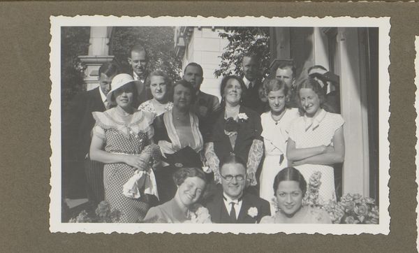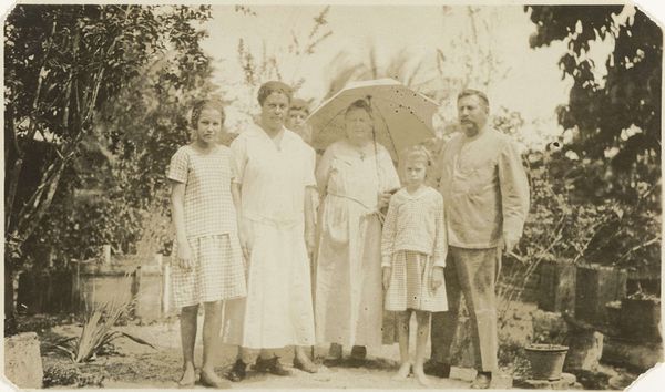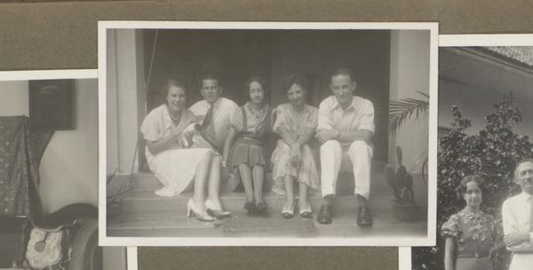 This tiny photograph captures Wilhelmina van Zijll de Jong, Dootje van Zijll de Jong, Tootje Wassink, Meinard Dorus Mijer, Catherine Gertrude van Delden, and Henriëtte Wassink, and it’s made with light and silver. The process here is less about crafting an image and more about capturing a moment, a slice of life. It’s like the artist is saying, "Here we are, in this instant, with all our quirks and imperfections." The light makes this a study in grey tones. The women in the picture wear floral patterns, yet their shapes are vague and hard to make out. Look how the lace curtain on the right gently contrasts with the window frame: its gentle curve softens the square geometry of the doorway. It looks like a painting by Gerhard Richter, a blurry photograph smudged into something soft and melancholic. We don't know who made this, but its ambiguity invites an emotional response. It’s like a half-remembered dream, an echo from the past.