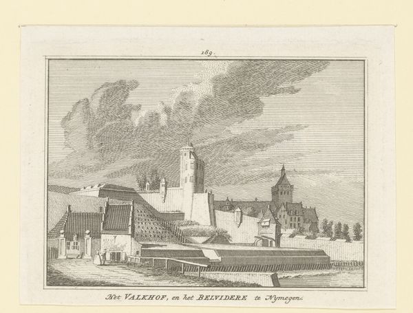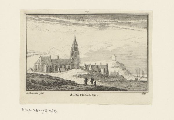 Curator: Ah, this little engraving is captivating. We’re looking at Abraham Rademaker’s “View of the Church at Scheveningen, 1630,” although it was created between 1727 and 1733. Isn’t it interesting how a landscape, so serene on the surface, can hold so much history? Editor: Serene is one word for it, I guess. I’m getting more of a “windswept, lonely outpost” vibe, actually. It’s all greys and stark lines. The church is massive against this turbulent sky…makes you wonder what the community endured, huddling around it. Curator: Exactly! That imposing presence is key. Churches, throughout history, represent stability, refuge. And in this Baroque piece, the dramatic sky, typical of the period, doesn't diminish that symbolic weight; it emphasizes the church’s unwavering presence. The Golden Age was all about moralizing landscapes. Editor: Maybe, but I find myself drawn more to the tiny figures with their cart, barely noticeable. It’s their story I want to know – what's their relationship to this behemoth structure looming over them? They appear to have walked a path before them, with ruts and markings in the foreground. Curator: They offer a human scale, I think. And that cart? Transportation, trade... the lifeblood of the community flowing beneath the church’s gaze. Think of the symbolism—earthly matters existing alongside spiritual guidance. Editor: I’m still caught on that steeple. It's almost needle-like, pointing aggressively towards the heavens, as if it's piercing through the angst ridden sky. But the building and it's mass seem protective rather than imposing, when imagining what its residents seek for. Curator: Perhaps a little of both. This piece holds within its small frame an interplay of security and aspiration that goes beyond its scale. That visual complexity, in the end, it's precisely what makes it endure, I feel. Editor: Yes, an entire history captured in what looks like a fleeting glance.