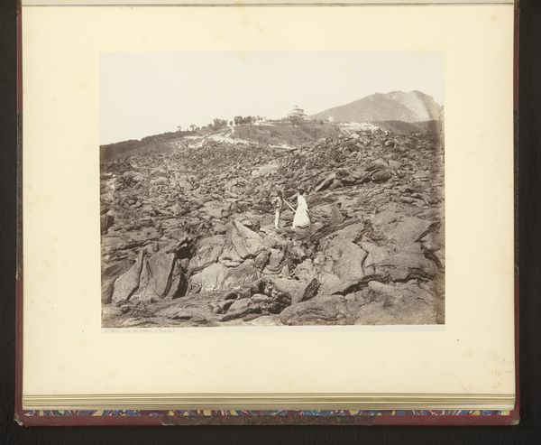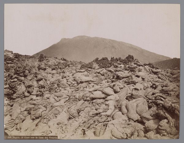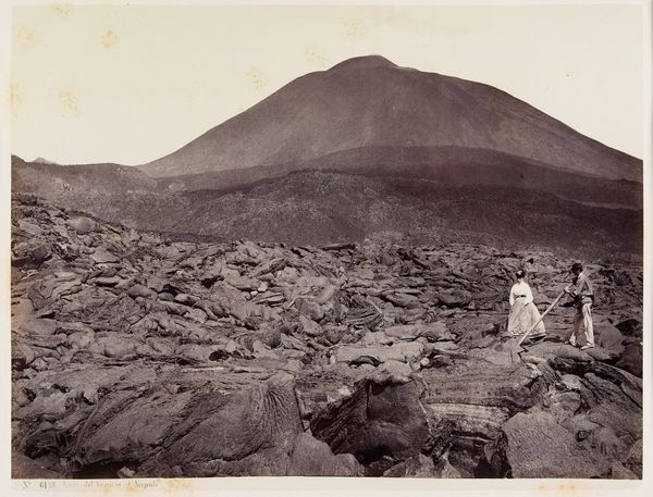 Editor: This is Giorgio Sommer’s "View of Vesuvius", taken between 1857 and 1914, a gelatin silver print currently housed in the Rijksmuseum. The scale is incredible; it feels desolate and almost lunar. What draws your eye when you look at it? Curator: Immediately, the focus goes to the material conditions – the solidified lava flow in the foreground. Look at the labor involved in even accessing this viewpoint and capturing the image with then-current photographic technology. It's not just a pretty picture; it's about understanding how resources were mobilized and used to create this representation of nature. Editor: I see what you mean about labor. What does that say about our relationship to nature as depicted here? Curator: The tiny figures atop the cooled lava are telling; the material choices of the artist emphasize the scale of the volcano, diminishing their human presence and suggesting the industrial process that rendered the final photograph, creating a market for consuming images of the natural world. Do you see evidence of human presence changing the environment? Editor: Well, they appear more as a demonstration of scale, making the volcano more immense. They seem to be spectators, maybe a hint towards future exploitation? I'm particularly struck by the different tones achieved using gelatin silver printing; it feels so tactile. Curator: Precisely. And consider the economic forces at play here – who could afford the equipment, the travel, the prints? This is more than just a landscape; it reflects a whole network of materials, labour, and consumption intertwined with our changing perspective of landscape. What a privilege it is to examine its intricacies.