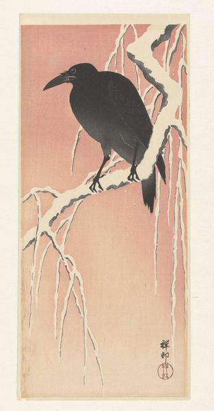 Editor: So here we have "Kraai," which simply translates to "Crow," a watercolor by Suzuki Kason from the late 19th or early 20th century. The crow is very present on the page. There's such incredible detail for watercolor, and that stark black against the pale background really creates a powerful focal point. What do you make of it? Curator: Oh, this piece calls to me. It whispers secrets of Zen gardens and quiet contemplation. Look how Kason uses the 'less is more' approach – so characteristic of Japanese art. The crow, a symbol often associated with mystery or even ill omen in the West, is, in many Eastern traditions, seen as a messenger, a guide between worlds. What do you feel the negative space contributes? Editor: That negative space gives it such an airy, almost spiritual quality, right? I hadn’t really considered the crow as a messenger, more like a…a mischievous observer? Curator: Exactly! And isn't that duality delicious? Kason’s masterful brushstrokes breathe life into this solitary crow, perched as if caught mid-squawk, sharing some urgent news with the wind. There's realism, but there is so much…implied emotion. Editor: It’s interesting how different interpretations can come from just shifting cultural lenses. I'll definitely be rethinking my crow associations from now on! Curator: Art, at its finest, invites us to challenge our preconceptions, doesn't it? It holds up a mirror, not just to the world, but to ourselves. Editor: Absolutely! I'm going to keep that in mind! Thanks for opening up this painting, and my mind, in new ways!