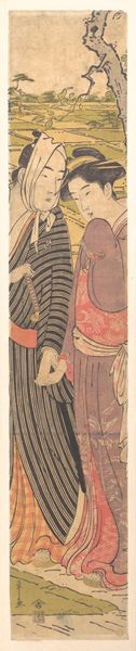 Kikugawa Eizan made this woodblock print, "Man and Girl," probably in the first half of the 19th century. This type of print is known as ukiyo-e, or "pictures of the floating world." They were made by specialized artisans, including the artist who designed the image, a wood carver who translated the design into a series of blocks, and a printer who applied ink to the blocks and pressed them onto paper. These prints were not considered "high art" at the time, but rather a form of popular culture, affordable to a wide audience. The process of making ukiyo-e was a collaborative one, involving the skills of many different people. Eizan's image is defined by bold lines, flat planes, and subdued colors. The black ink defines the figures, while the pale pinks and browns add depth and texture. The print has a graphic quality, reminiscent of modern illustration, but it also reveals the hand of the artist in the subtle variations of the wood grain, and the slight misalignments of the blocks. It's the trace of labor that makes this image so compelling.