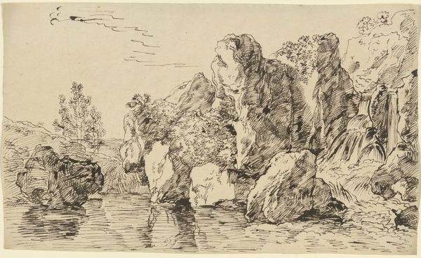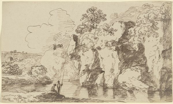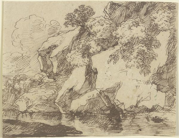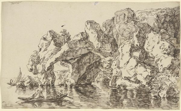 Editor: Here we have "Felsentor an der Meeresküste mit Fischerbooten" - or "Rock Gate on the Seacoast with Fishing Boats" - an ink drawing by Franz Kobell, currently at the Städel Museum. I’m struck by the intricate linework; it almost feels like peering through a tangle of branches. What stands out to you in this composition? Curator: Indeed, the density of the line is quite remarkable. Notice how the artist uses hatching and cross-hatching not merely to delineate form, but to build tonal variations. This manipulation of light and shadow creates depth. The rugged rock formation is brought to the foreground and the figures are rendered as secondary. What do you make of that visual choice? Editor: That's a great point, it emphasizes the grandeur of nature over the human element. I hadn’t really considered that. So the boats and figures aren’t the subject, they’re just…accents? Curator: Perhaps. Consider, though, how Kobell frames the distant horizon line through the archway of the rock. It invites the viewer's eye into the distance, almost mocking the seascape scene. Where the artist focuses on minute visual effects, the subject acts to direct the audience to continue observation. Editor: It’s almost like the landscape itself is an actor. I suppose I focused too much on what was 'drawn' rather than *how* it was drawn. Curator: Precisely. The drawing's strengths are rooted in how it presents structural forms through considered manipulation of shade. I appreciate how Kobell manages to merge detail and dramatic tone using only ink on paper. Editor: I’ll definitely be paying closer attention to how artists use line and shading in the future. There’s so much to learn from a single drawing when you focus on those qualities.