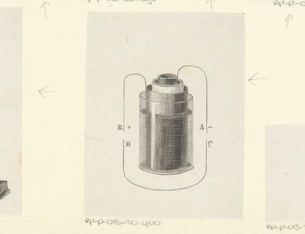 Editor: This is Charles Garjian's "Pewter Foot Warmer" from 1936, rendered in pencil. The precision and detail are striking. What do you see in this piece from a formal perspective? Curator: The meticulous application of graphite, graduating from light to dark, establishes a compelling three-dimensionality. Note how Garjian exploits line and tone to articulate the geometric form; observe in particular the dialogue between the hard edges and the smooth curves. The adjacent technical drawing only further abstracts its symbolic weight. Editor: I notice how the light seems to catch the metal differently across its surfaces, making it appear almost alive. How does this drawing technique impact your understanding? Curator: The texture that he evokes, and that play with light, amplifies our perception. Garjian prioritizes the material properties, pushing them to become central subjects for interpretation. Consider, too, how the tonality serves as both an evocative attribute and an essential organizational strategy within the pictorial space. Editor: So it's not necessarily about function, but about its composition? Curator: Precisely. We engage less with the implied purpose of this object and more with how formal properties articulate themselves. How do you see its geometric properties? Editor: It’s intriguing how the geometric contrasts with that ornate handle on top. It almost makes me think about the relationship between functionality and artistry. Thanks, I appreciate this way of viewing artwork. Curator: Likewise, examining the piece through its form has offered us fresh perspective.