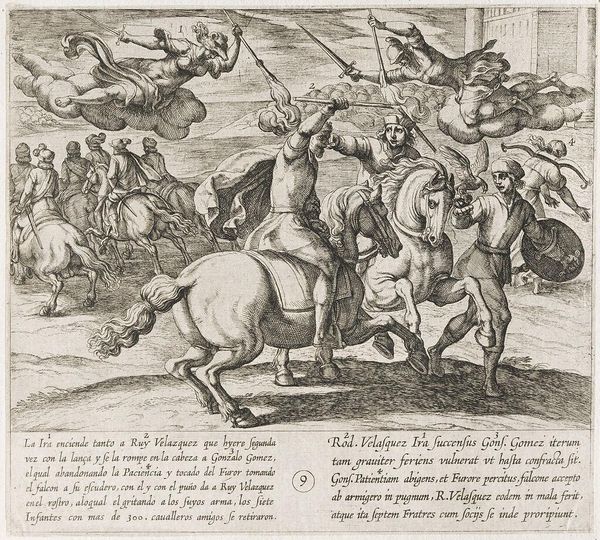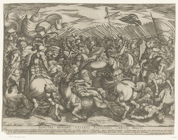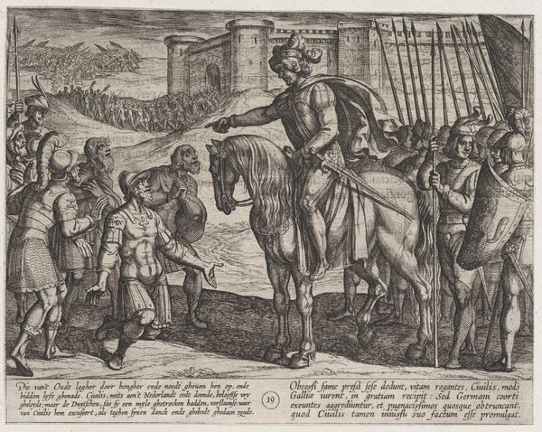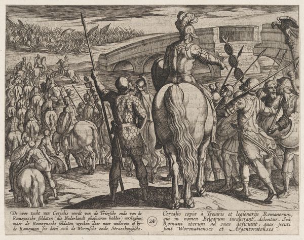 Antonio Tempesta created this print, "Civilis Separates German and Dutch Troops," around 1612 as part of a series on the Batavian revolt against Rome. The image presents a moment of high drama, steeped in the politics of its time. The series reflects the Dutch Republic's struggle for independence from Spain, drawing parallels with the ancient Batavians' fight against Roman rule. It's fascinating how history becomes a mirror, reflecting contemporary issues of identity and resistance. The artist casts the Batavians as heroic figures, skillfully manipulating historical narratives to bolster the Dutch cause. Consider the emotional weight of such imagery during a time of war. This wasn't just history; it was a call to arms, a way of forging a national identity through a carefully constructed vision of the past. The print participates in the construction of national identity and the complexities of historical narratives, filtered through the lens of contemporary struggles.