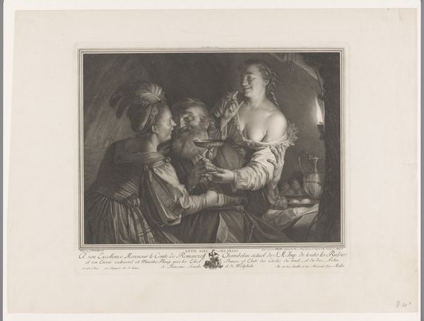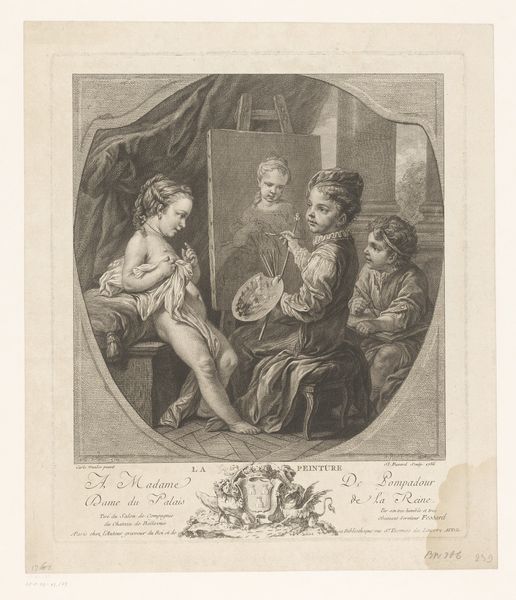 Editor: Here we have "Spelende kinderen," or "Children Playing," an engraving made in 1765 by Johann Caspar Schwab. It depicts a playful scene. I find the composition a little odd; the figures seem oddly framed, like a snapshot taken through a window. What catches your eye about this piece? Curator: Indeed, the framing device is worth noting. But consider the lines: the sharp, clean strokes that define each form. Look how Schwab employs varied densities of hatching to sculpt the figures from the flat plane, creating an illusion of depth and volume, especially in the draping fabric of the girl’s dress. It is about the skillful rendering of forms and textures. What is your initial assessment of the engraving technique? Editor: Well, the lines are certainly precise, and I can see the detail in the folds of their clothing. So the artistry really resides in the manipulation of the medium itself, more than the subject matter. Curator: Precisely. Disregard, for a moment, the anecdotal subject. Instead, focus on the organization of the visual elements: the distribution of light and shadow, the contrast between the tightly rendered faces and the more loosely defined background. Do you notice how that contrast drives the eye to certain areas of the picture plane? Editor: Now that you mention it, my eyes are drawn to the interaction of the figures. I suppose it's less about the "children playing" and more about how that sense of action and depth is achieved through the composition and technique. Thanks for shifting my perspective on this piece. Curator: And thank you for your observations. Analyzing art from this perspective allows us to really look past narrative, straight to formal structures.