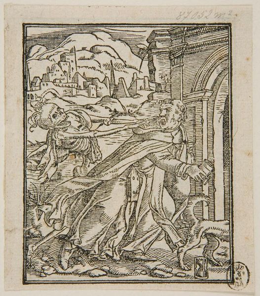 Editor: This woodcut, "The Fall of Babylon" by Hans Holbein the Younger, is intensely detailed. The contrast between the heavenly figures above and the ruined city below is quite striking. What can you tell me about the social context of this work? Curator: Holbein was deeply embedded in the Reformation. Prints like this functioned as visual propaganda. Babylon, in this context, symbolizes the perceived corruption of the Catholic Church. Notice how the celestial realm triumphs over earthly destruction; it's a powerful statement about religious reform. Editor: So, the imagery is deliberately provocative? Curator: Absolutely. Consider the intended audience; these prints were circulated widely, shaping public opinion and fueling the Reformation movement. Do you see any specific symbols? Editor: The lamb with the cross, perhaps? Curator: Exactly. It speaks to sacrifice and spiritual authority, presented as the alternative to the fallen "Babylon." I've never considered the Reformation as media. Editor: It’s fascinating how art becomes a tool for societal change. Curator: Precisely. And how our interpretation is shaped by the historical forces at play.