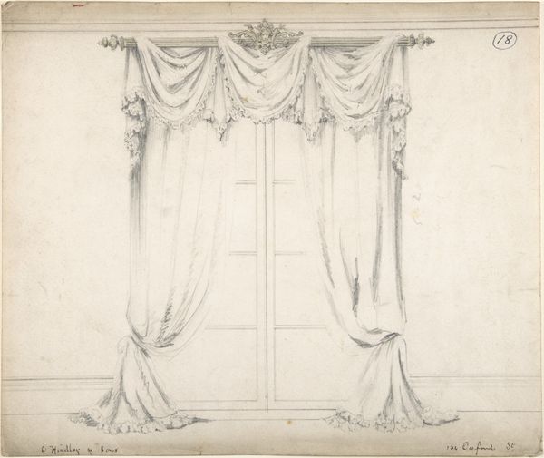 Curator: Here we have a drawing from between 1800 and 1850, titled "Design for a Canopied Bed with Pale Blue and White Hangings." It's currently held at the Metropolitan Museum of Art. Editor: It feels surprisingly airy and open for a bedroom design, especially considering the substantial canopy. The palette is very restrained, almost austere. Curator: Restrained, yes, but consider the materials likely envisioned. The pale blue and white would be luxurious textiles – silks and fine cottons, indicative of considerable expense and social standing. Notice how the drawing emphasizes the fall and drape of the fabric; that reflects the high value placed on these imported goods. Editor: The line work is so delicate; you almost feel the light filtering through the curtains. And there's a precision in the architectural detail. This drawing focuses on the overall composition and arrangement, doesn’t it? The placement of that window opposite the bed... everything feels very carefully calibrated for visual harmony. Curator: Indeed. Neoclassical design heavily influenced this era, as you can see in the symmetry, balanced proportions and restrained ornamentations.. Beyond aesthetics, consider the labour involved. This design wouldn't be realized without teams of weavers, dyers, seamstresses… all contributing to this image of luxury. Editor: Right, and yet that labor is invisible in this pristine rendering. We are left only with the finished product: an image of serene comfort, carefully constructed. But how functional is a room that's built this formally and architecturally? Curator: Perhaps its functionality is to broadcast wealth, taste, and control over one’s environment. That speaks volumes about social structures in the early 19th century. The object reveals this context, after all. Editor: It's fascinating how much visual information the drawing conveys about materiality, labor and context. Curator: Indeed, from threads to social fabrics, we can infer a great deal.