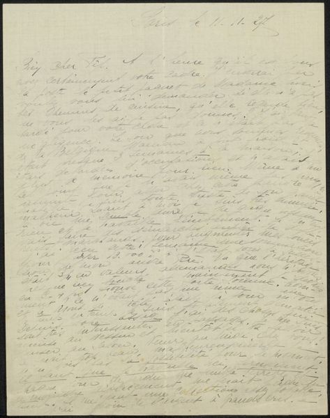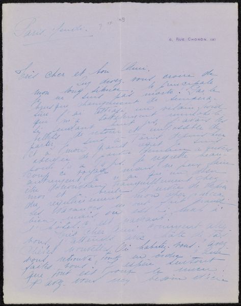 Editor: Here we have “Brief aan Philip Zilcken,” potentially from 1926, crafted with mixed media on paper—ink and pen. It looks like a handwritten letter, maybe a draft? There's a real intimacy in seeing the artist's handwriting. How do you interpret this work, considering its historical context? Curator: That's an excellent observation. What strikes me immediately is how this seemingly personal artifact provides a glimpse into the artistic and social networks of the time. Letters were crucial for communication, for building and sustaining communities, especially within the art world. Do you notice the date at the top? Editor: Yes, it seems to say May 2nd, 1926. Curator: Precisely. So, think about the socio-political landscape of the 1920s. It’s a period of recovery after the First World War, witnessing the rise of modernism and new artistic movements. Letters like this become vital documents in understanding the behind-the-scenes dialogues and the daily concerns artists were grappling with. How might this informal communication shape or reflect larger trends? Editor: That's interesting... It suggests that even casual correspondence could contribute to shaping the art world's discourse and its institutions. Were letters considered valuable or even archival material in their time? Curator: Often, no. It's through later collection and study that they gain such weight. They give insight into not only the artist's practice but the entire support structure – the galleries, patrons, and other artists - surrounding them. In essence, it shows the 'making of art' as a deeply social and collaborative process. Editor: So this letter isn't just a personal note; it’s a fragment of art history. It shows how artistic reputation is built over time, across formal and informal channels. Curator: Exactly. Seeing the art world not just through finished works in museums, but through the mundane communications is transformative.