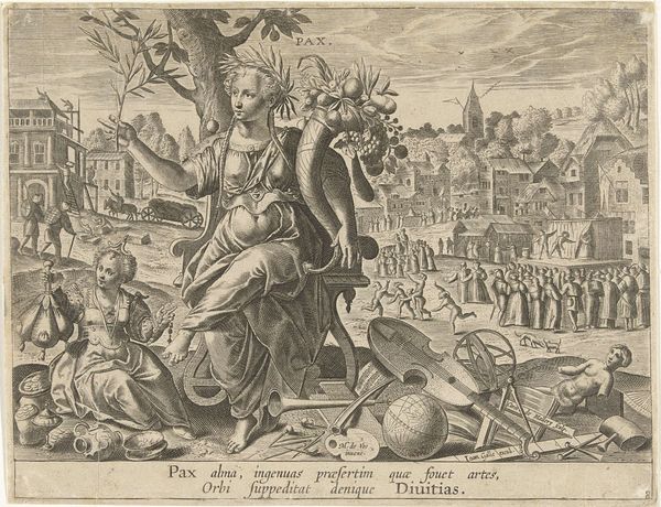 This engraving, "Italië, met Venus en Apollo," was made by Johann Sadeler I around the late 16th century. During this period, cartographic representations were not merely geographical but also vehicles for expressing cultural and political ideologies. Here, Italy is personified through Venus, the goddess of love and beauty, who is presented with a cornucopia, symbolizing abundance. She is paired with Apollo, god of music, poetry, and light. These classical figures are not just aesthetic choices but reflect the Renaissance’s deep engagement with classical antiquity. They act to legitimize Italy's cultural and intellectual authority. Apollo offers a book, which underscores the country’s heritage of art, philosophy, and literature. However, this idealized vision obscures the realities of a fragmented Italian peninsula, often at war and under foreign influence. By visually associating Italy with timeless deities, Sadeler transcends the earthly conflicts of his time, suggesting an enduring essence of Italian identity rooted in beauty and intellectual achievement. It invites us to consider how cultural symbols are used to shape national identities and project power.