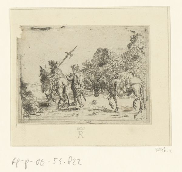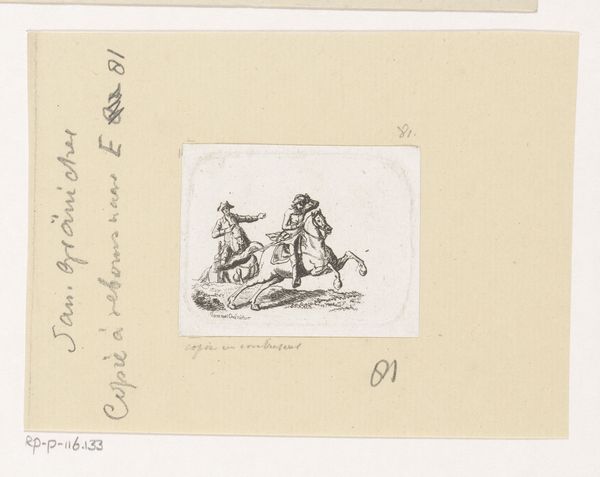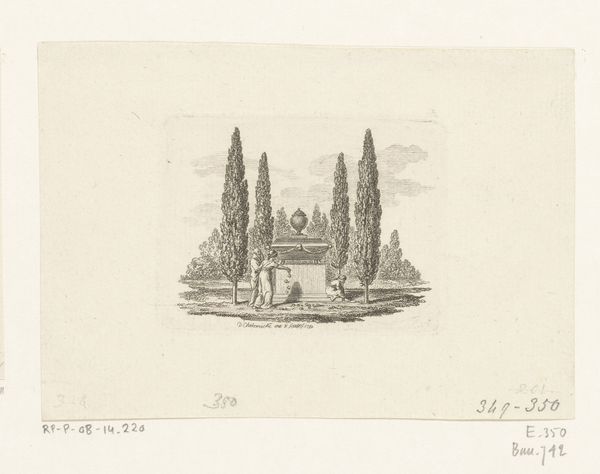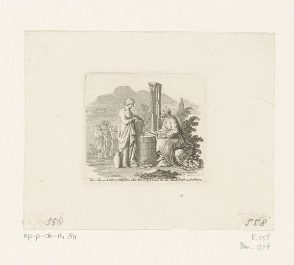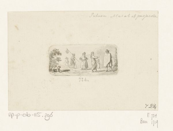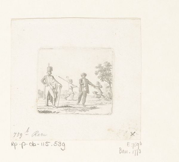 Curator: This etching by Daniel Nikolaus Chodowiecki, made in 1794, is titled "Verschillende types naast een hek," which translates to "Different Types Beside a Fence." Editor: It’s remarkably delicate. I’m drawn to the line work and the seemingly mundane subject; figures by a fence, a touch melancholic almost. Curator: Chodowiecki was deeply invested in portraying the social strata of his time. Prints like these allowed for wider dissemination of social commentary. Note the detail given to each figure—clothing, posture, these signify their place. Editor: Precisely. I am keen on how etching enabled Chodowiecki to mass produce images, democratizing art while meticulously attending to the subtleties of attire and even facial expressions, embedding social signifiers directly into the material. How accessible would prints like these have been? Curator: They were relatively accessible, yes, and often used in publications, spreading ideas alongside images. It's intriguing to consider the role such images played in shaping public perception, isn't it? The museum context changes the way we engage with these. Editor: Indeed. The museum as a context frames these prints now less as utilitarian tools and more as artifacts embedded within a complex material and historical web. Considering its status as print, its function becomes ambiguous—high art? Popular culture? Both, inevitably. I am taken by how it blurs boundaries, making us rethink the conventional definitions that often categorize it within art history. Curator: I agree completely. His attention to the subtleties of class and character are telling. His work encouraged people to see themselves reflected in art, and, maybe more importantly, see others as well. Editor: It makes you think about who had access to such items, what inks and papers were used in this period, and how distribution might reflect networks of power and commodity. Curator: Thinking about Chodowiecki’s place in the late 18th century reminds me how much art functions within, and reflects, societal structures. Editor: Absolutely, analyzing how art, labor, and materials intertwine enables a deeper comprehension of artwork's intricate layers and social impact.