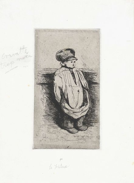 Curator: This is Arnoud Schaepkens' "Young Girl with Dog", likely created sometime between 1831 and 1904. It's an etching, a type of printmaking. Editor: It’s rather haunting, isn’t it? The starkness of the etching creates this strange solemn mood. And those eyes! They’re so direct. Curator: The process of etching itself lends to that austerity. Think about it: the artist carefully scratches into a waxed metal plate, then immerses it in acid. It’s an industrial process almost, far removed from a spontaneous brushstroke. How does that affect our understanding of the work as a portrayal of innocence? Editor: It’s fascinating how he uses the medium to convey form. Look at the lines; some are deeply etched and densely packed to suggest shadow, others are faint and widely spaced, giving the impression of light. The tonality relies heavily on contrasts and juxtapositions. Curator: And that contrast can be connected to the subject, I believe. The girl stands between domesticity – symbolized by her apron and small dog – and the world outside. Who was she? What labor was she already undertaking, if any, at that age? How did societal pressures of gender shape her self-perception even as a child? These aren't mere visual arrangements; they are social documents. Editor: Perhaps, but let's not overlook the formal components that make it affecting regardless of her specific circumstances. See how the diamond composition anchors the figure but lets your eye wander, drawn to specific aspects of light and form, making for an interesting image. The dog is such a minor character yet grounds the etching to a relatable setting. Curator: I would say that every compositional choice reinforces certain historical and societal realities that otherwise might have been overlooked by us now. For instance, dogs were not considered pets to be adored as often; they aided with different types of work depending on where someone lived. What do we see and not see through this class, gender and location filter? Editor: Perhaps it's precisely that open-endedness of an etching that allows many of these discussions to emerge. Curator: Absolutely. By considering both process and formal aspects, we create fuller access points to its cultural framework and its potential meaning today.