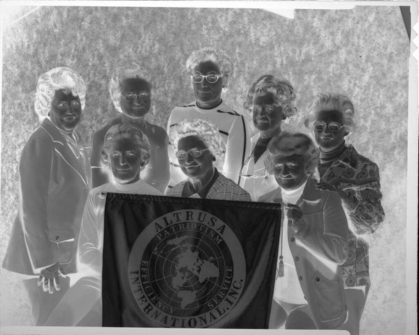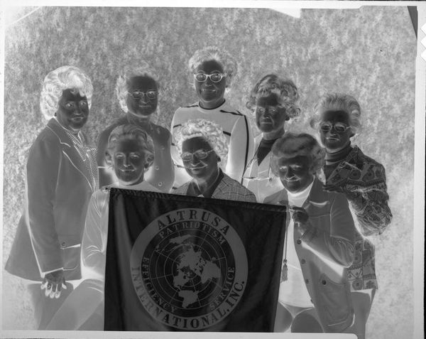 Editor: Here we have an Untitled photograph by C. Bennette Moore, showing a group, some dressed as clowns. The composition is quite striking. What do you see in this piece? Curator: The stark contrasts immediately draw the eye. Notice how the tonal range, from deep blacks to bright whites, creates a visual dynamism. The photographer uses the frame almost as a stage, organizing the figures into distinct planes. Editor: The arrangement certainly adds to the intensity. Curator: Precisely. The interplay between light and shadow sculpts the forms, lending them a sculptural quality. It makes me consider the formal aspects of portraiture. How do you see the materiality affecting the viewing? Editor: It seems that without color we see the shapes and forms in a new way. Curator: Indeed. By analyzing such elements, we can explore the very nature of the photographic medium. Editor: I learned so much about looking at photos today. Curator: As did I, revisiting the basics always helps.