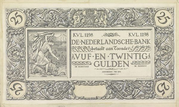 Editor: This is a preparatory drawing for "De Hollandsche Lelie, Weekblad voor jonge dames" – or "The Dutch Lily, a weekly magazine for young ladies" – made between 1901 and 1915 by Theo Neuhuys, primarily in ink. It's striking how the design manages to be both ornate and quite rigid in its structure. What do you see as you look at the piece? Curator: Indeed, its structural clarity is paramount. Note the deliberate compartmentalization and how Neuhuys controls our eye through contrasting weights of line and shape. Observe the symmetry imposed onto the title itself. The visual impact arises not from free expression but from the calculated arrangement of form and typography. The geometric rendering of those lilies, for example, aren't they interesting in the repetition, almost to the point of abstraction? Editor: They're quite stylized, and the typeface is really lovely! Are there other elements you find especially compelling? Curator: Consider the spatial relationships. The solid blocks of text against the open, decorative borders. It is through these contrasts that the design achieves visual balance. One can also analyze it semiotically. The lily motif itself: What might it signify in this context of a magazine for young ladies? Purity? Refinement? And how does that symbolism contribute to the overall composition? Editor: I hadn’t considered the symbolic implications so closely, that's very helpful to contextualize what I’m looking at. Thank you. Curator: My pleasure. Hopefully it sharpens one's focus on the deliberate compositional strategy.