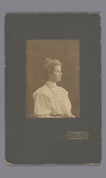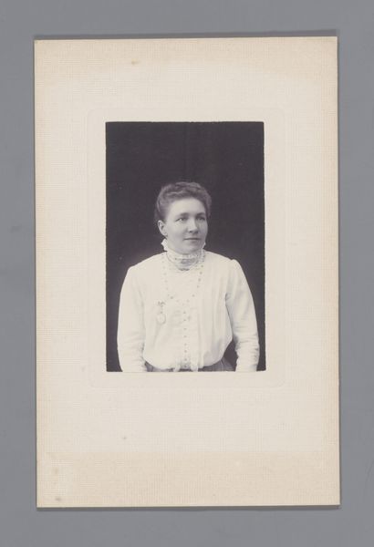 Curator: This is a captivating albumen print titled "Portrait of Fanny Janauschek," dating from around 1860. The artist is Johann Philipp Hoff, and the work now resides here at the Städel Museum. Editor: The portrait’s scale is striking; the detail in her face really pulls you in. There is something in her expression that suggests a certain stoicism, an interiority, don't you think? Curator: Indeed. Janauschek was a celebrated actress, known for her intensity and emotional range on stage. Hoff's photograph captures a glimpse of that inner strength. The albumen process itself, of course, contributes to this richness, enhancing the tonal gradations and overall sharpness. Editor: And those gradations do interesting work around her face, directing light to specific angles to cast certain shadows around the eyes and mouth. But do we know anything about her public image? I am curious as to what types of role she usually accepted. Curator: Janauschek built her reputation performing powerful female characters in dramas and tragedies. Looking at the politics surrounding performance at the time, actresses navigated expectations of respectability with the potential for significant personal expression on stage. Editor: Her dress, high-necked and rather severe, also lends itself to that respectability. However, it’s what she is wearing—what that materiality does for us, formally. Note the interplay between the textured fabric of her dress and the smooth, almost porcelain quality of her skin, which emphasizes the difference between performance and a posed portrait, but hints that the artifice of performance can also penetrate one’s person. Curator: Fascinating observations. We might also consider the broader implications of portraiture during this period. Photography provided a burgeoning middle class with opportunities for visual self-representation. It challenged previous visual norms, shifting power dynamics in how people understood each other in visual formats. Editor: So, an early form of visual democratizing! Looking at it today, the piece reminds us that a single image can be layered with so much intention and cultural context. It certainly brings us to acknowledge the role of actresses like Janauschek as pioneering figures in society. Curator: Agreed, a fascinating intersection of individual character and larger societal trends. The albumen print offers a tangible connection to a pivotal era.