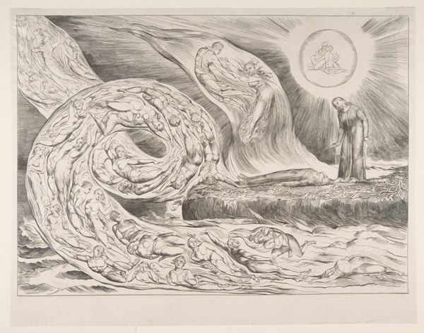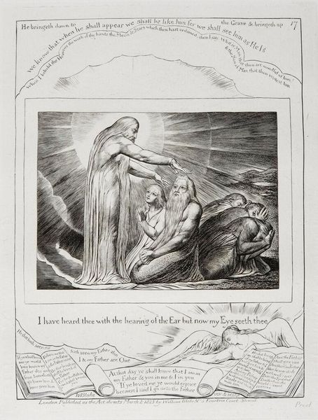 Editor: So, this is "The Vision of God," an etching and engraving by William Blake, dating back to 1825 or 1826. It's currently at the Metropolitan Museum of Art. I’m immediately struck by its... intensity, almost a mystical quality created by the contrast of light and shadow. What leaps out at you when you look at it? Curator: Intensity is spot on, my dear. Blake, bless his soul, was always striving to depict the un-depictable, the divine made visible. What's so fascinating here is the sheer weight of the figures, bowed down and heavy with earthly experience, and then BAM, that light cascading down! Feels like divine energy almost physically imposing itself. You see that gesture of blessing or imposition, it really directs the narrative, doesn't it? How does that action strike *you*? Editor: It feels… weighty, like a profound responsibility being transferred. Also, the contrast with the figures huddled in darkness makes the moment of enlightenment all the more powerful. It’s almost overwhelming. I mean, it has texts at the top and bottom! How does all of that textual stuff shape how you see the image itself? Curator: Ah, yes, Blake and his love for the marriage of image and text! It’s crucial, really. He wasn't illustrating a story already told; he was *creating* a mythos, drawing from biblical language, but forging something entirely his own. Look at the lines, how they create both form and a sense of swirling energy, all guided by the inscriptions…It is such a Romantic notion – the artist as prophet! You feel it, don't you, that radical sense of a world remade? Editor: Definitely. It’s like he’s building his own symbolic language, bit by bit. The light and dark, the figures, the words... it’s all interconnected. Curator: Precisely! And now you’re fluent in Blake-speak! It's easy to be initially overwhelmed by these dense tableaus but focusing on that interconnectedness will really allow you to explore everything Blake is conveying! Editor: Absolutely. It’s a much more unified artwork now in my mind.