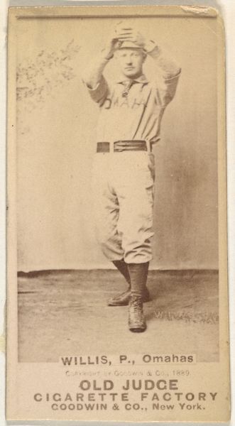This promotional card from the Old Judge Cigarettes series, made by Goodwin & Company in the late 19th century, presents a portrait of Foutz, a pitcher for the Brooklyn Bridegrooms. The sepia tone imbues the image with a sense of nostalgia, emphasizing the sitter’s posture and the baseball he holds. The composition divides into distinct zones: the player, the obscured background, and the advertising text. Foutz's figure is rendered with careful attention to the light reflecting the contours of his uniform. The background, a nebulous field, appears to flatten the depth and pushes Foutz forward. The lower register is dedicated to the Old Judge Cigarettes logo, an early example of branding which uses the full frame of the baseball card to capture attention. The interplay between representation and commerce raises questions about the relationship between sport, celebrity, and consumer culture. It marks a critical moment in the commodification of leisure and the transformation of athletes into marketable images.