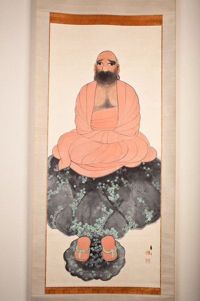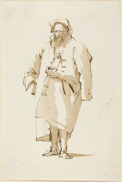 Léon Bakst created this work, "Sadko one of the chorus," as a costume design. Immediately, what strikes us is the figure's vertical presence, emphasized by the staff and elongated robe. The composition is deceptively simple, yet it achieves a striking balance. The artist has masterfully contrasted the ornate details of the headdress with the plainness of the robe, creating a visual tension that holds our gaze. Note the use of line—crisp and precise in the hat, soft and flowing in the beard—each contributes to a sense of texture. The limited palette of ochre and blue is not merely decorative but structurally important. The strategic placement of blue, like those accents on the hem of the robe, anchors the figure. Bakst destabilizes the conventional hierarchies of design, elevating costume design to the status of art. The use of line, color, and form isn't just aesthetic; it's a semiotic system, a code through which Bakst communicates ideas about identity and representation. This piece embodies a cultural discourse where art challenges and reshapes our understanding of tradition and modernity.
