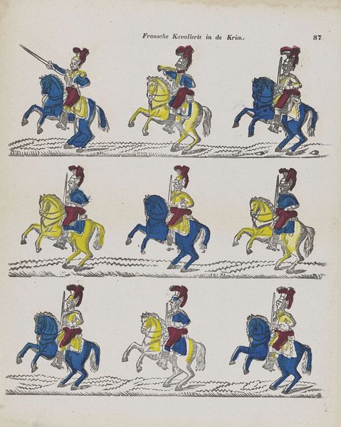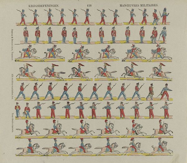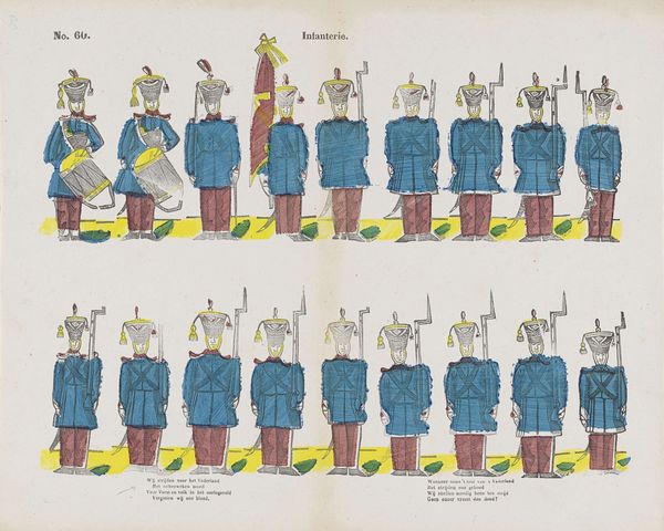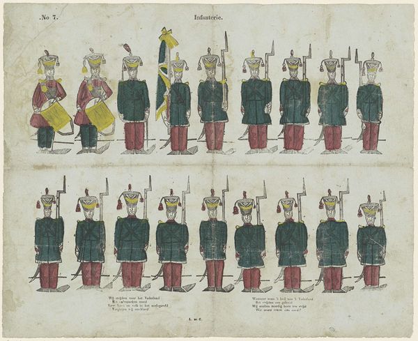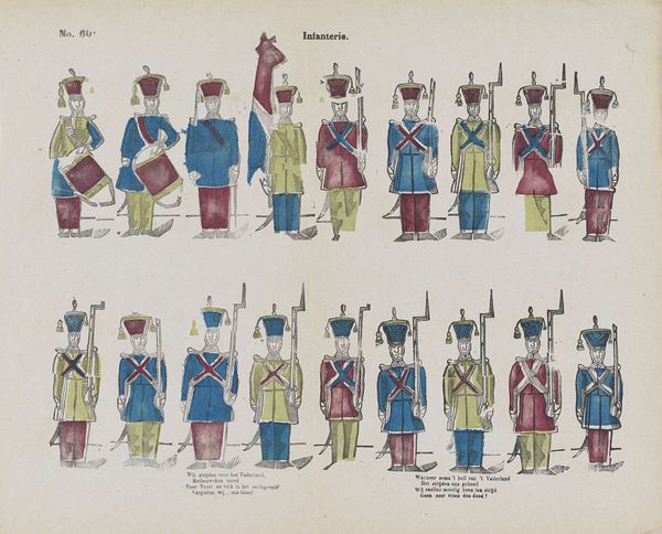 Curator: Welcome. Here we have "Fransch linie voetvolk / Infanterie de ligne Francaise" a lithograph and drawing by Philippus Jacobus Brepols, dating from between 1800 and 1833. It resides here at the Rijksmuseum. Editor: It’s… curious. Like a uniform catalogue but with an oddly flat, almost childlike perspective. Curator: Childlike is an interesting observation, I hadn't considered that. The presentation here is indeed straightforward: rows of soldiers in varying states of dress, presumably for identification purposes. Notice the way the figures are carefully outlined, filled with watercolor, giving the two-dimensional surface an interesting sense of depth without adhering to true realism. Editor: Absolutely, and each figure acts as a signifier of military power. Their rigid stance, the spears, the uniforms – all contributing to the mythos of the French army. The red trousers strike me as particularly symbolic – they invoke bravery, courage, even aggression. Curator: Indeed. And perhaps consider that Romanticism, known for its evocation of strong emotional responses, influenced both genre and historical painting in this period. Although Neoclassicism’s influence is certainly evident, notice its clean lines and somewhat restrained composition. Editor: I see that restraint acting as a counterbalance to the symbolism of the French infantry during this turbulent era, when Napoleon was building an Empire on conquest. To the modern eye, they might almost look like toy soldiers marching to an old tune. Curator: Fascinating. Each row almost represents a kind of visual encoding, a formal structure for power, communicated through symbol. Brepols here acts as both illustrator and communicator. Editor: It seems that while on the surface the piece functions as a record of dress, beneath the layers lies a rich symbolic representation of France during this pivotal period. Curator: I concur, making "Fransch linie voetvolk" far more than a record. A visual poem with layered implications. Editor: Yes. One that resonates long after we've walked away.