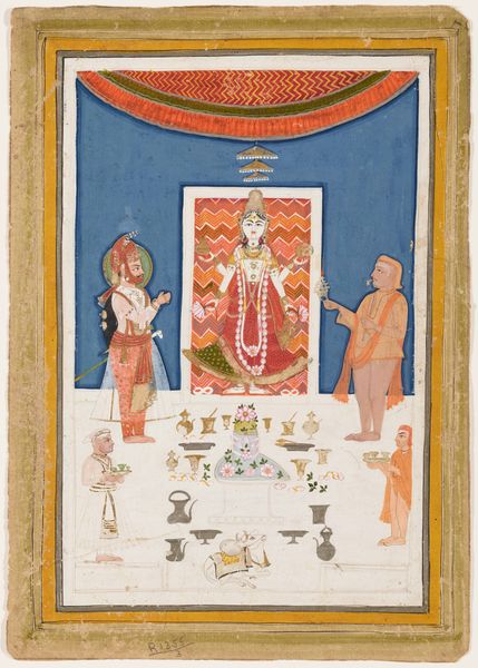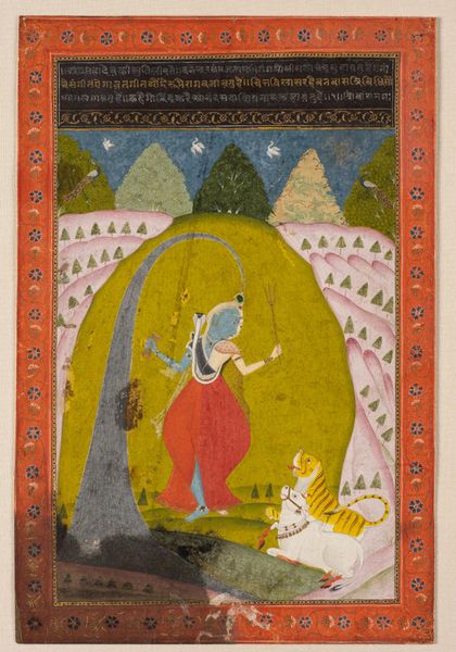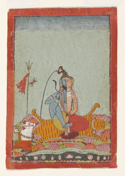 Sajnu's "Vishnu on Garuda" presents us with a watercolor rendering of the Hindu deity Vishnu, supported by Garuda, his mount. This artwork invites us to reflect on themes of divine power and service, depicted through traditional iconography. In Hindu tradition, Vishnu is often seen as the preserver and protector, a role imbued with notions of masculine strength, and righteousness. His depiction here adheres to established conventions, from the multiple arms symbolizing his power, to the regal crown connoting his status. Similarly, Garuda, with his part-human, part-avian form, embodies loyalty and devotion, willingly serving as Vishnu's vehicle. Yet, within this representation of power dynamics, there's a deeper narrative about the relationship between the divine and the earthly, the ruler and the ruled. Consider how the artist, Sajnu, navigates the visual language of hierarchy and devotion. How does the painting reinforce or perhaps subtly challenge the viewer's understanding of power and faith? It's in this interplay that the artwork encourages us to contemplate our own positions in society and spirituality.
