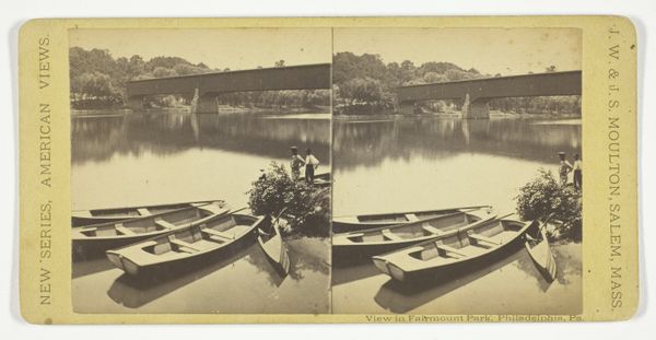 Editor: This is "Gezicht op een baai," or "View of a Bay," a gelatin silver print photograph from 1875-1890 by C. Dietrich. It's striking how the stillness of the water creates almost a mirror effect. What do you see when you look at this piece? Curator: Primarily, I observe a composition carefully constructed around tonal values. The darker masses of the trees to the left anchor the image, leading the eye across the water, which gradually lightens in tone towards the distant horizon. Do you notice how the photograph avoids sharp contrasts? Editor: Yes, it all seems very deliberate, with those subtle gradations of gray. Is there any kind of balance going on? Curator: Precisely. There is balance. The eye is drawn from the detail of the foliage across the water. There is also an anchoring with those tiny figures present along the treeline, perhaps in boats or at the shore. Editor: So, it's about the formal relationship between the tones and the balance within the composition rather than a specific subject matter? Curator: Indeed. It's the interplay between the masses, lines, and gradations that creates its aesthetic effect. We observe nature translated through a particular lens and process, rather than nature presented directly. Editor: I’m beginning to appreciate the artist’s focus on the qualities of the photograph itself. The delicate balance certainly adds to its enduring appeal. Curator: Absolutely. It's a testament to the artist's control over light and shadow, crafting a scene where form precedes representational meaning.