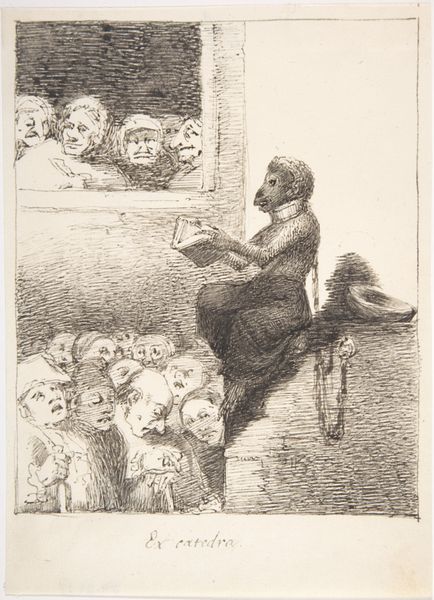 This is "Hilan delgado," a print made by Francisco de Goya, who lived from 1746 to 1828. Goya's chosen process, etching, is a powerful method for creating linear detail and tonal variation, achieved through the careful application of acid to a metal plate. Notice how the etched lines define the figures' forms, emphasizing their age and physical decay, but also drawing our attention to the textures of their clothing and the objects surrounding them. This work's social significance comes from its unflinching portrayal of poverty and marginalization. The printmaking process itself, with its reliance on skilled labor and the production of multiples, mirrors the social issues of labor and class that Goya explores within the image. By focusing on the materials and making, we can appreciate how Goya challenges traditional distinctions between fine art and craft, using a 'replicable' medium to tackle complex social themes.