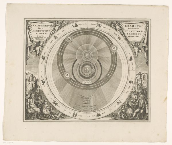 Editor: So, here we have an engraving from between 1660 and 1708, "Hemelkaart van het stelsel van Ptolemaeus" – a celestial map of Ptolemy's system. It's fascinating! I’m struck by how it merges scientific diagramming with decorative elements of its time. What's your take on it? Curator: I’m immediately drawn to the material production of this image. Consider the labor involved in the engraving process – the skilled artisan meticulously etching this intricate design onto a metal plate, a plate that then becomes a means for the reproduction and wider distribution of this cosmological model. This map, therefore, isn't just about illustrating Ptolemy’s theory; it's about the societal values placed on scientific knowledge and artisanal craftsmanship, as well as its economic potential. Editor: That’s a really interesting way to see it, focusing on the act of creation itself! I was more caught up in interpreting the image… the way the planets are depicted… Curator: But how do those depictions, the iconography and its associated knowledge, circulate? They circulate via things like *this* print, distributed and consumed widely. Look at the choices the engraver made. This wasn’t just functional; the Baroque flourishes tell us this object served a decorative purpose too. Is this “art” or a scientific diagram? Was it intended for a scholarly audience, or wealthy collectors looking to show off their knowledge of the world? Editor: So you're saying that the way it was made and circulated influences how we understand its meaning, not just the imagery itself? Curator: Precisely. The materials, the process, the social context - all contribute to its significance, shifting our perspective away from pure aesthetics and more toward tangible historical meaning. Editor: I’ve definitely learned to think about art beyond just its surface. Looking at the physical making and how it was meant to be consumed offers so much more context. Curator: And reveals how intertwined the artistic and economic worlds truly are.