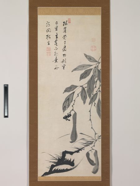 Curator: Gazing at Eiraku Hozen’s “Fox with Staff (Hakuzōsu)” from the mid-19th century, my first thought is of elegant solitude. Editor: I see more deliberate choices – look at the aged paper, its slight imperfections. It seems carefully selected as the ground for this ink drawing to accentuate its historical dimension and the very idea of legacy. Curator: Exactly! There’s a lovely layering. You have this rather simple drawing, a few strokes of ink bringing a fox figure to life on toned paper, topped with graceful calligraphy—a trinity of elements each talking about the other in quiet tones. Editor: It’s a brilliant use of minimalist resources, which demands careful selection. I bet Hozen was quite specific when choosing ink and the tools of application. You can see how the paper interacts with the ink washes. It's about precision, not waste. Curator: Indeed. The artist coaxes magic from humble means. This solitary fox becomes this potent little whisper in ink, striding out of the unknown, guided by the gentlest touch on aged paper. What do you suppose Hakuzōsu represents to Hozen? Editor: A fox spirit holding a staff? We have to think of labor, maybe itinerancy or the act of traveling to different locations, maybe for sourcing or distribution. The material choices available to the artist are determined by social access and wealth. What appears simple to the eye is a testament to larger material realities. Curator: Or perhaps something even more personal! Think of the ukiyo-e tradition where we see glimpses of ordinary life, raised almost to the level of poetry. The fox might be carrying some deep feeling through this landscape. In the end, a drawing like this hints at so many potential worlds – both the obvious and those unseen. Editor: Agreed, and by bringing the conversation down to the tools and materials—paper, ink—we can also understand how accessible those worlds may have been, who gets to record them and whose labor is invisibilized in its making. I like how we come away with a new appreciation by bringing new questions into its sphere. Curator: Beautifully put, truly, to witness is to keep asking and thinking and drawing a path closer to some elusive truth of why these beautiful creations pull us.
