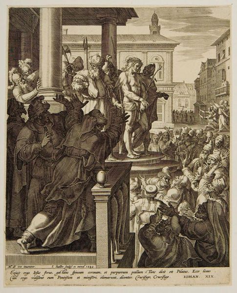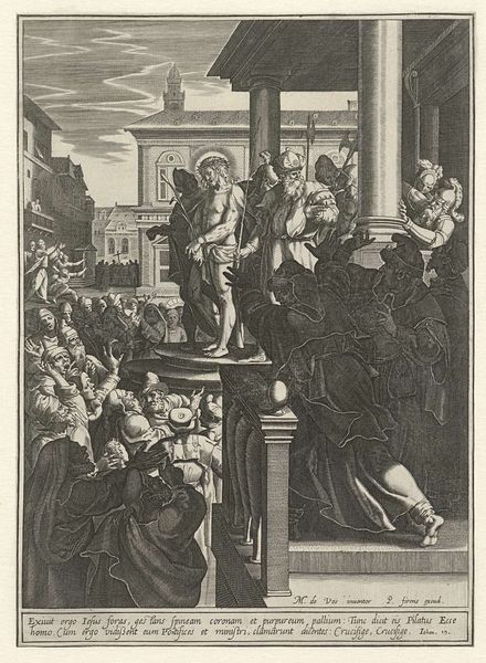 Editor: So, here we have Jacob Matham's "Marriage of Mary and Joseph," an engraving created sometime between 1601 and 1605, currently at the Rijksmuseum. The detail achieved through the engraved lines is remarkable. Overall, it feels quite formal and structured. What do you see in this piece, focusing on its formal elements? Curator: Observe the artist's skillful deployment of line and form. The linear quality dominates; Matham uses line weight and density to define shapes and suggest depth. Note how the composition is carefully arranged, leading the eye through the different planes, and creates distinct groups with clear boundaries. Editor: It's true, the figures are clearly delineated. It almost feels staged, doesn’t it? I mean in terms of the compositions. Curator: Staged, perhaps, is one way to interpret the artist’s intentional structure. However, let's consider the architecture depicted. How does the artist’s rendering of the building influence your understanding? Notice how it frames the central action, thereby dictating the space for the ceremony. How do you interpret that as being crucial to meaning in the image? Editor: Good point! The building almost compartmentalizes the participants and directs our focus entirely to Mary and Joseph. And by looking at this engraving in the terms of lines, it highlights each element and meaning separately for us to have a clear grasp of everything shown. Curator: Exactly. The architectural context is vital to understanding Matham’s careful ordering of forms to serve both an illustrative and intellectual purpose. It speaks volumes about his knowledge. Editor: This way of analysis by closely observing and analyzing formal properties opened new dimensions to appreciate it. Curator: Indeed, through detailed visual exploration, the structural language comes into view.