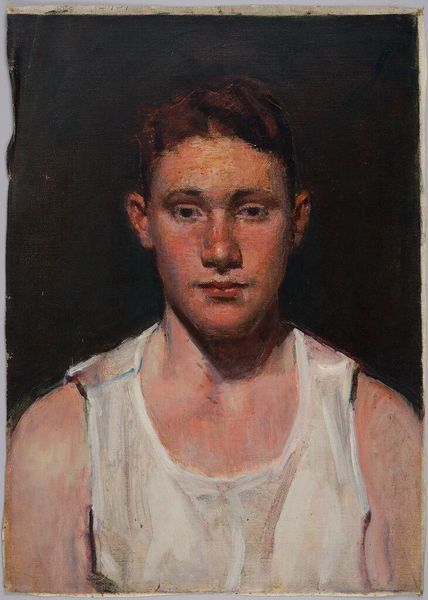 Curator: I'm struck by the contrast – the dark background sets off the model's skin, almost like a spotlight. Editor: Indeed. This is Denman Waldo Ross’s "Walter Nelson", currently held at the Harvard Art Museums, measuring about 54 by 38 centimeters. It reads as an exploration of early 20th-century masculinity. The direct gaze carries a challenge. Curator: Perhaps. Or perhaps the work reflects the artist's personal circle and social standing, where the male nude served as a symbol of elevated cultural and intellectual pursuits. What do you think of the brushwork? Editor: The strokes are quite visible, aren't they? Raw, almost unfinished, disrupting the smooth, idealized forms we might expect from a classical portrait. This rawness lends an honesty. Curator: Well, the portrayal certainly stirs thoughts about class, power, and how the male body has been historically viewed and presented. Editor: I agree. It's an interesting, imperfect capture.
