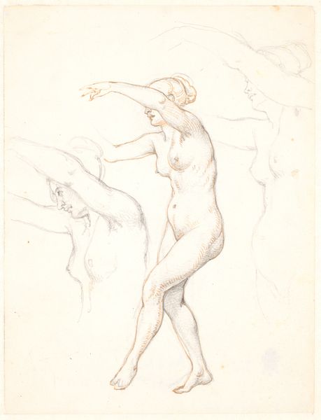 Editor: Here we have "A Nude Female Figure, Standing. Same Figure Repeated, with Another" by Thomas Stothard. It’s a delicate sketch, almost dreamlike, with these figures layered on top of one another. What strikes you about this piece? Curator: Well, this piece reflects the eighteenth-century’s fascination with classical ideals and the burgeoning role of the Royal Academy in shaping artistic norms. Note how Stothard uses the female nude to explore idealized beauty, a practice deeply embedded in the social and academic structures of the time. Do you see how the repetition of the figure might speak to the academy's emphasis on mastering form through constant practice and emulation? Editor: That's a great point. I hadn't considered the academic context and the role that played in the artist's choices. Curator: Considering this work within its historical context, we see how artistic training and societal expectations shaped the very representation of the human form. Editor: I'm now seeing the piece as part of a wider cultural conversation. Thanks!