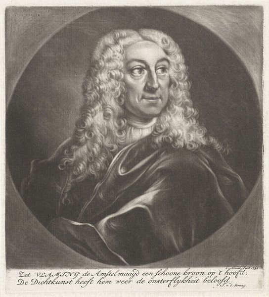 Curator: Looking at this portrait, I am struck by the somber and reflective mood emanating from it. Editor: Yes, Johannes de Groot’s portrait drawing from the early 18th century of Joan van den Honert is indeed a very intriguing image, currently housed in the Rijksmuseum collection. De Groot captured van den Honert in charcoal with meticulous detail. Curator: The artist’s use of charcoal to achieve such nuanced shading and texture, especially in the hair and fabric, is remarkable, wouldn’t you agree? It begs the question of why charcoal was specifically selected, versus, say, a pen and ink, for this portrait. Its accessibility, affordability? Editor: Precisely, charcoal offers a softness and depth that aligns well with Baroque portraiture’s intent to convey character and status. More broadly, consider who commissioned such works—elites eager to solidify their positions through artistic patronage and strategic display of power. Curator: It speaks volumes about artistic and societal hierarchies—portraiture became a visual marker for entry into a specific class. Editor: And how these depictions often played out within the domestic settings of wealthy Dutch homes. A piece like this served to project both public authority and familial pride. How art was integrated into one’s private spaces also informed social relationships of that time. Curator: Furthermore, the act of making a charcoal drawing would be less labour intensive or financially taxing. This could offer a path of access to portraiture, bypassing oils and painted portraits. It would open artistic practice up. Editor: Yes. Also notice the oval frame. A symbol reinforcing convention but simultaneously, subtly influencing how viewers engage with and legitimize such imagery. These frames weren’t just aesthetic choices; they were integral components to conveying significance and legacy. Curator: This glimpse into the life and context of both the artist and sitter provides invaluable context for understanding this work, doesn't it? It illuminates broader power dynamics present at the time. Editor: Indeed, a closer examination shifts our appreciation for how an artist and medium together shaped a society.
