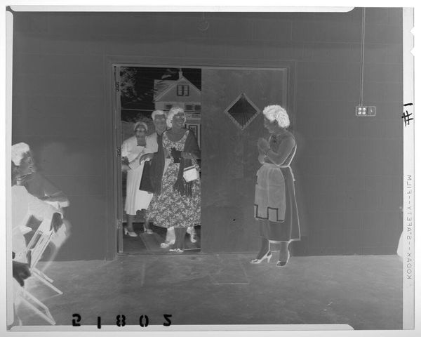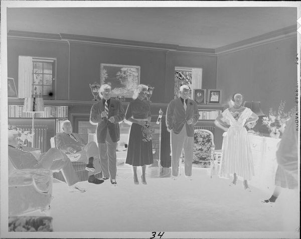 Editor: Here we have "Untitled (family on couch by window)," a black and white photograph by Lucian and Mary Brown. It's quite small, and the inversion of tones gives it an eerie feel. What strikes you about this photograph? Curator: The photographic process itself is key here. We see the raw material of film, manipulated to capture a staged domestic scene. The labor involved, from setting the shot to developing the negative, speaks to a specific social practice of family portraiture and its consumption. Editor: So, you are focusing on the making and the context rather than, say, the family dynamic portrayed? Curator: Precisely. The image becomes an artifact, revealing the means of production and the social rituals tied to photographic technology. It makes me wonder about the family's access to, and engagement with, this technology. Editor: I hadn't considered that angle; it’s fascinating to think about it as a product of labor and technology. Curator: Exactly! It shifts our perspective from the sentimental to the material.