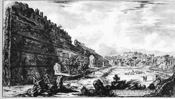 Editor: Here we have Giuseppe Zais' "Mountain Landscape with Picturesque Buildings," painted sometime between 1724 and 1784. The whole composition feels very theatrical to me, like a stage set. What jumps out at you when you look at this piece? Curator: Oh, the romance of ruins, absolutely! Zais is serving us a delightful pastiche of idealized nature. Imagine wandering through a land that whispers tales of fallen empires. It’s like a daydream, isn’t it? Do you think it looks monochrome because of time? Editor: It looks like it could be, and the description suggests the artworks presents a monochrome pallette! What does this lack of colors, or their weathering due to the course of time, evoke in your experience? Curator: It heightens the sense of a bygone era, wouldn't you agree? Perhaps even a longing for something irretrievably lost, but found once again. Consider how Zais guides our gaze with the careful arrangement of light and shadow, the theatrical buildings contrasting the quiet calm in the distance, or not. Editor: Yes, the details of everyday life give the artwork its full tone. There are contrasts everywhere! So much to see, and reflect about. Curator: Precisely! And perhaps that is what Zais wanted us to perceive all along: life itself captured in that precise state of sublime contradiction. What an image... and all this by making us see the landscape from a birds eye view. Editor: That’s beautifully put. I appreciate how you connected it to the personal, while reflecting on such grand topics. Curator: The beauty of art is it can invite this interplay. Never be afraid to ask what this image evokes from your own interior, and trust it will make its sense!